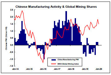 Chinese manufacturing had enjoyed a prolonged expansion since early 2017 which helped build positive sentiment for investments in the mining sector (as illustrated in the fourth chart in the right hand panel and the view below of the most recent five years).
