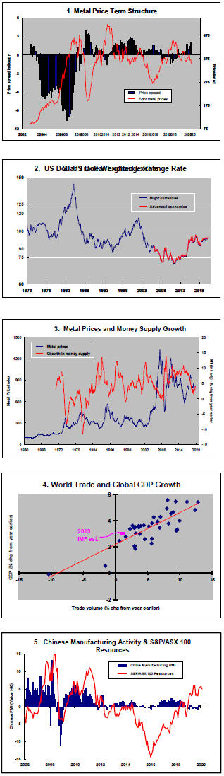 Halting the cyclical decline now evident, nickel aside, would most likely require some combination of higher global growth than currently anticipated, U.S. dollar weakness or more supportive monetary policies. Each of these three key influences is moving through a transitional phase with none pointing conclusively in the right direction although financial markets are pushing central banks to ease monetary settings.