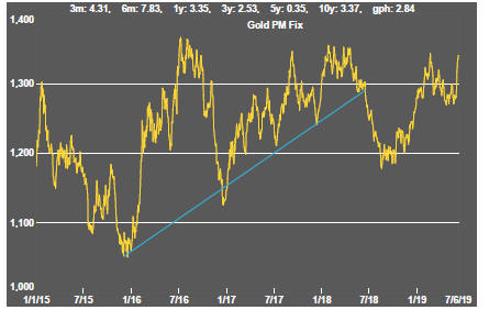 The US dollar tipped lower, adding some support to gold prices. The currency move might have reflected expectations of a cut in US interest rates. Any downward bias could prove short-lived if recourse to a safe haven is needed in the event of further evidence of slowing global growth.