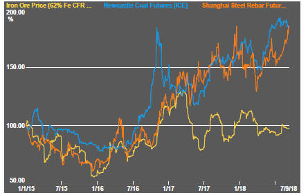 Higher steel prices have not been reflected in stronger iron ore price outcomes. Coal prices continue at high levels reflecting China’s drive to source cleaner energy and as constraints on new mine development keep a rein on supplies.