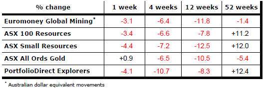 Global mining sector prices fell by more than 3% during the week to take the index below its level from 52 weeks ago. The gap in performance between the market leaders and the exploration end of the sector narrowed during the week after the largest stocks had been outperforming the small stocks over the past three months.