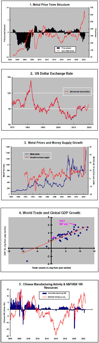 The greatest danger to a metal price cycle comes when monetary policy settings begin to tighten in response to higher inflation with an adverse effect on output growth and investment spending.