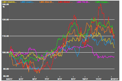 Daily traded metal prices generally drifted lower to converge around similar returns for 2017 as the year comes to a close.