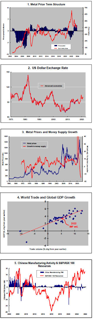 The greatest danger to a metal price cycle comes when monetary policy settings begin to tighten in response to higher inflation with an adverse effect on output growth and investment spending.