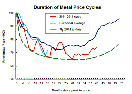 Using the prices of the six main daily traded base metals - aluminium, copper, lead, nickel, tin and zinc - the blue line in the chart shows, for the nine price cycles since 1960, the profile of the average adjustment following each cyclical price peak.