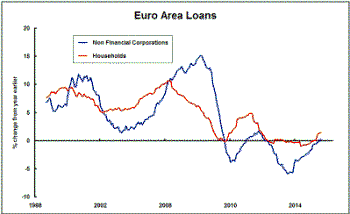 Loans taken out by non-financial corporations in the euro area have ceased contracting but increased by only 0.1% over the 12 months to August 2015. Household sector demand for loans has grown more rapidly. Outstanding amounts at the end of August were 1.5% higher than a year earlier.