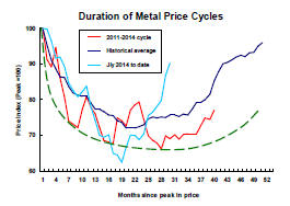 Using the prices of the six main daily traded base metals - aluminium, copper, lead, nickel, tin and zinc - the blue line in the chart shows, for the nine price cycles since 1960, the profile of the average adjustment following each cyclical price peak.
