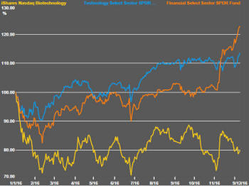 The effect on biotech share prices has faded but financial stocks have continued to benefit from expectations of reduced regulation. Higher bond prices will have started to improve the pricing power of companies in the sector.