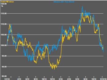 The rapid fall in bond prices has contributed to the slump in gold prices and the poor performance of gold related equity prices in the past four weeks.