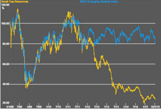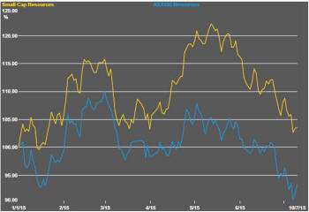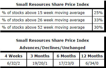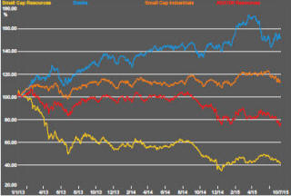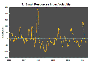 The small resources share price index fell by 2.8%. The S&P/ASX 100 resources index fell 1.1%. The small resources share price index has returned to levels at which it traded in November 2014 but the index covering the largest stocks in the sector has been faring worse. It traded at a new cyclically low level as iron ore prices remained volatile but also showed no sign of a cyclical improvement that would benefit the large miners.