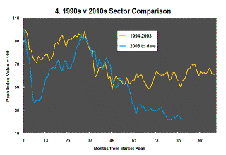 Sector prices have adjusted to the next level of support. The parallel with the 1990s illustrated in Chart 4 is being tested. Prices will have to stabilise around current levels for several months for the thesis to hold.