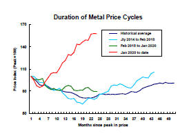 Time, of itself, is not important but the sequence of adjustments which are typical of a commodity price cycle and contribute to changed prices and expectations does take time. A more detailed analysis of metal price cyclical duration is available here. The downswing phase of a cycle has an average duration of approximately 20 weeks.