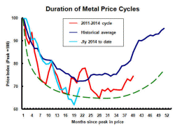 Using the prices of the six main daily traded base metals - aluminium, copper, lead, nickel, tin and zinc - the blue line in the chart shows, for the nine price cycles since 1960, the profile of the average adjustment following each cyclical price peak.