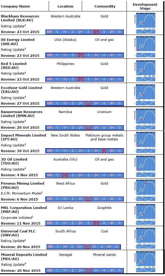 Stocks with relatively low ratings are regarded as more risky (i.e. less likely to achieve their exploration or development goals over a reasonable investment time horizon) than those with relatively high ratings.