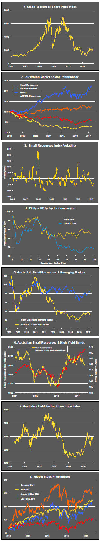 The ASX small resources share price index continues to display unusually low volatility (see chart 3 in the right hand panel). Prices have hovered near unchanged for the past year and near levels which had prevailed in 2014-15.