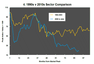 Sector prices have adjusted to the next level of support. The parallel with the 1990s illustrated in Chart 4 is being tested. Prices will have to stabilise around current levels for several months for the thesis to hold.