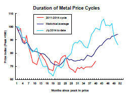Using the prices of the six main daily traded base metals - aluminium, copper, lead, nickel, tin and zinc - the blue line in the chart shows, for the nine price cycles since 1960, the profile of the average adjustment following each cyclical price peak.