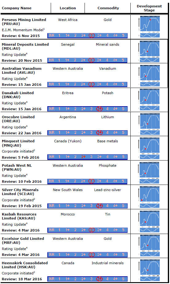 Stocks with relatively low ratings are regarded as more risky (i.e. less likely to achieve their exploration or development goals over a reasonable investment time horizon) than those with relatively high ratings.