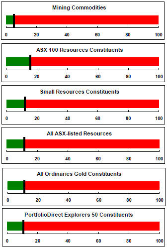 With a median decline in prices of ASX-listed resources companies since the beginning of 2011 of 89% (and 30% of companies suffering a decline of more then 95%), the majority of stocks remain prone to strong 'bottom of the cycle' leverage in response to even slight improvements in conditions.