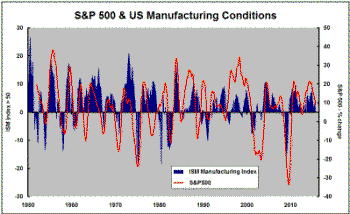 The chart shows the deviations from a reading of 50 in the ISM index (in the blue bars) and the smoothed rate of change in the S&P 500 share price index (in the red line). The S&P 500 index has fallen 4.7% over the past 12 months. The smoothed 12 month stock returns are still positive but heading lower.