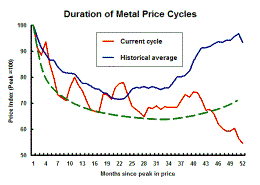 Using the prices of the six main daily traded base metals - aluminium, copper, lead, nickel, tin and zinc - the blue line in the chart shows, for the nine price cycles since 1960, the profile of the average adjustment following each cyclical price peak.