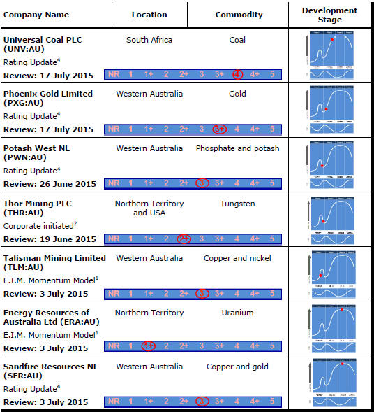 Stocks with relatively low ratings are regarded as more risky (i.e. less likely to achieve their exploration or development goals over a reasonable investment time horizon) than those with relatively high ratings.