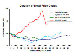Using the prices of the six main daily traded base metals - aluminium, copper, lead, nickel, tin and zinc - the blue line in the chart shows, for the nine price cycles since 1960, the profile of the average adjustment following each cyclical price peak.