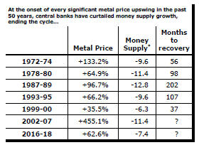 The monetary constraints already applied to the global economy are consistent with the metal price cycle nearing or being past its peak, based on the historical reactions to declining growth in monetary aggregate,,