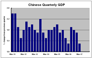 The Chinese economy grew by 1.3% in the March quarter or at a 5.3% annualised rate implying an outcome significantly below those in the second half of 2016.