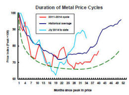 Using the prices of the six main daily traded base metals - aluminium, copper, lead, nickel, tin and zinc - the blue line in the chart shows, for the nine price cycles since 1960, the profile of the average adjustment following each cyclical price peak.