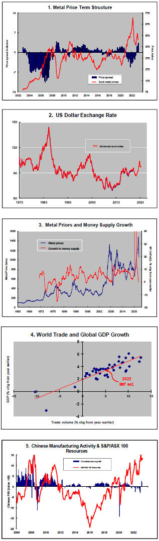The greatest danger to a metal price cycle comes when monetary policy settings begin to tighten in response to higher inflation with an adverse effect on output growth and investment spending.