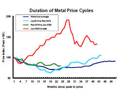 Time, of itself, is not important but the sequence of adjustments which are typical of a commodity price cycle and contribute to changed prices and expectations does take time. A more detailed analysis of metal price cyclical duration is available here. The downswing phase of a cycle has an average duration of approximately 20 weeks.