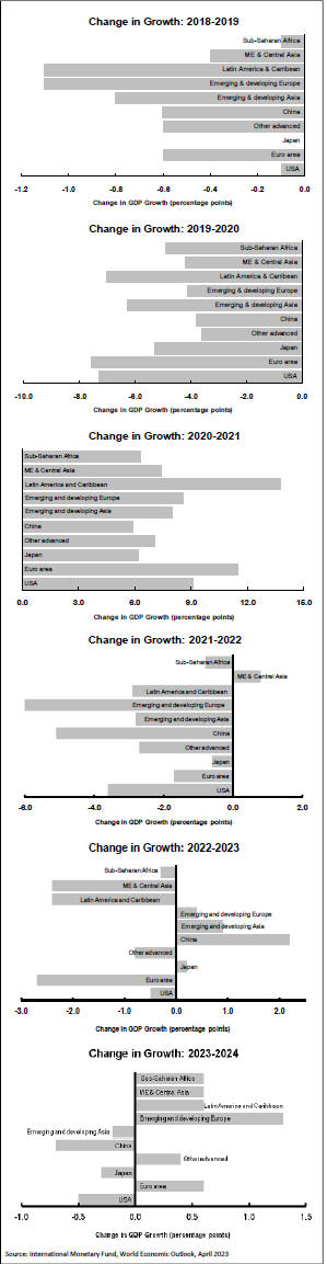 Positive variations in IMF growth forecasts during 2021 have given way to downward revisions as the negative forces detrimentally affecting growth prior to the onset of the COVID-19 pandemic reassert themselves and as emergency policy measures supporting growth are withdrawn.