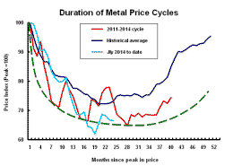 Using the prices of the six main daily traded base metals - aluminium, copper, lead, nickel, tin and zinc - the blue line in the chart shows, for the nine price cycles since 1960, the profile of the average adjustment following each cyclical price peak.