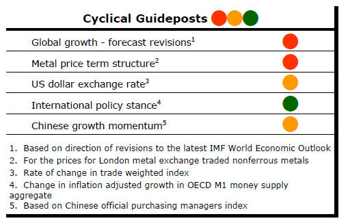 From mid 2014, the metal market cyclical position was characterised as ‘Trough Entry’ with all but one of the PortfolioDirect cyclical guideposts - the international policy stance - flashing ‘red’ to indicate the absence of support.