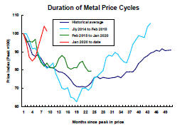 Time, of itself, is not important but the sequence of adjustments which are typical of a commodity price cycle and contribute to changed prices and expectations does take time. A more detailed analysis of metal price cyclical duration is available here. The downswing phase of a cycle has an average duration of approximately 20 weeks.