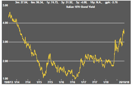 US government bond yields flicked higher but losses have been curtailed by the pursuit of safe havens during the equity sell-off. German government bond prices have benefited similarly with uncertainties over Italian budget policy being an additional factor influencing European capital flows.