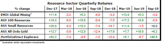 Resource sector equity prices reflected the broader market with modest losses once again defying expressions of pessimism about the global growth outlook. The price indicator used to track exploration investments rose dramatically after a high grade copper-gold intersection by Stavely Minerals, one of the constituents of the index, produced a recently rare discovery.