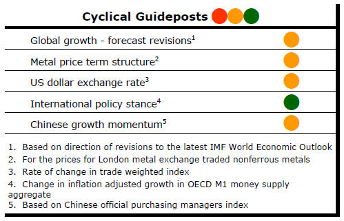 From mid 2014, the metal market cyclical position was characterised as ‘Trough Entry’ with all but one of the PortfolioDirect cyclical guideposts - the international policy stance - flashing ‘red’ to indicate the absence of support.