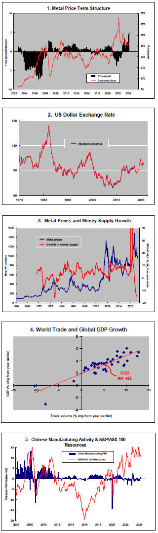 The greatest danger to a metal price cycle comes when monetary policy settings begin to tighten in response to higher inflation with an adverse effect on output growth and investment spending.