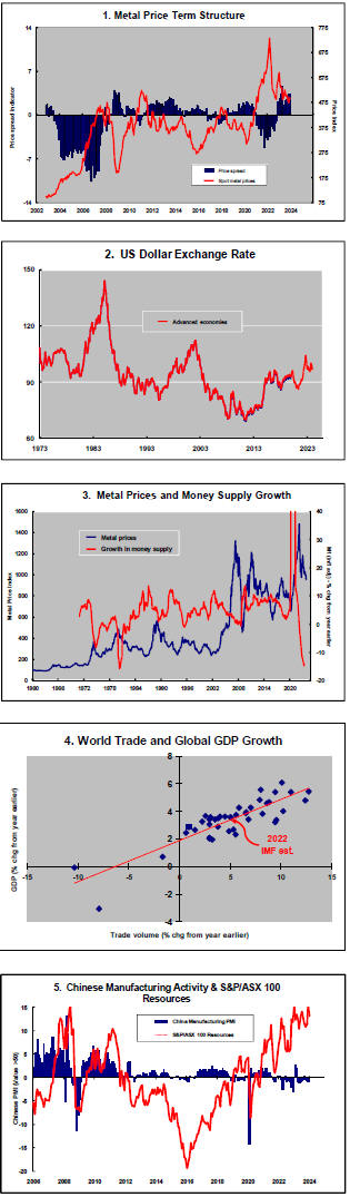 The greatest danger to a metal price cycle comes when monetary policy settings begin to tighten in response to higher inflation with an adverse effect on output growth and investment spending.
