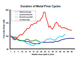 Time, of itself, is not important but the sequence of adjustments which are typical of a commodity price cycle and contribute to changed prices and expectations does take time. A more detailed analysis of metal price cyclical duration is available here. The downswing phase of a cycle has an average duration of approximately 20 weeks.