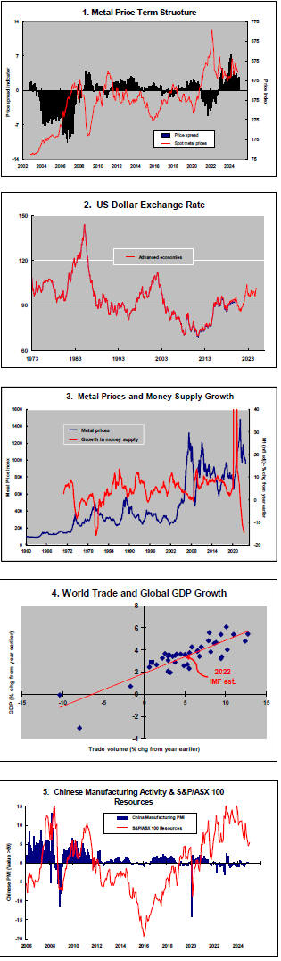 The greatest danger to a metal price cycle comes when monetary policy settings begin to tighten in response to higher inflation with an adverse effect on output growth and investment spending.