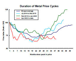 Using the prices of the six main daily traded base metals - aluminium, copper, lead, nickel, tin and zinc - the blue line in the chart shows, for the nine price cycles since 1960, the profile of the average adjustment following each cyclical price peak.