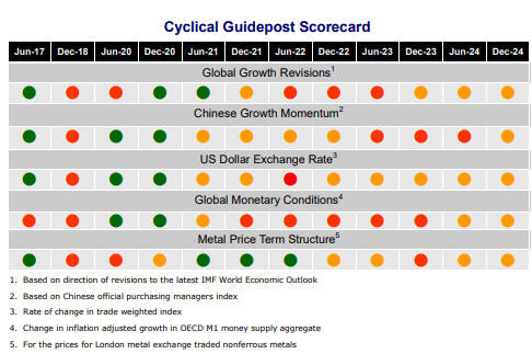 Through February 2016, the first signs of cyclical improvement in nearly two years started to emerge. The metal price term structure reflected some moderate tightening in market conditions and the guidepost indicator was upgraded to ‘amber’ pending confirmation of further movement in this direction.