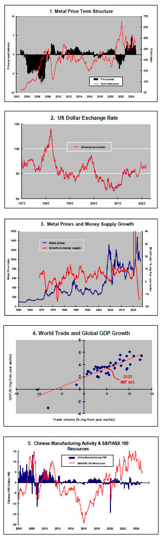 The greatest danger to a metal price cycle comes when monetary policy settings begin to tighten in response to higher inflation with an adverse effect on output growth and investment spending.