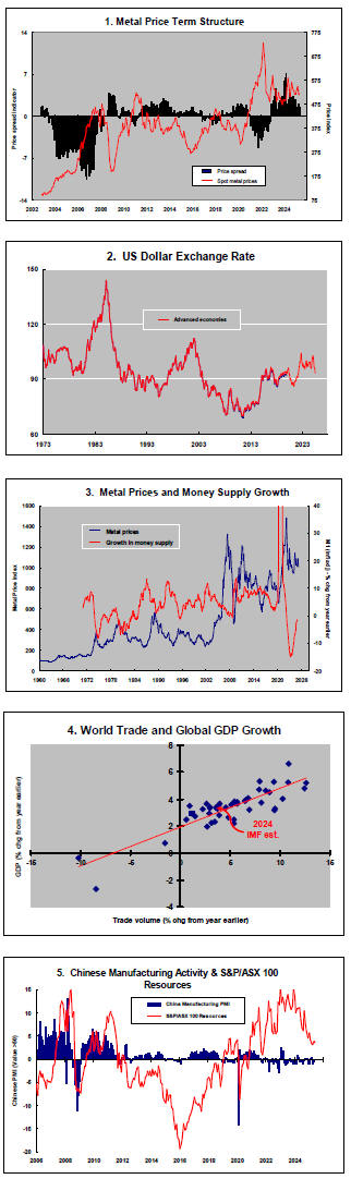 The greatest danger to a metal price cycle comes when monetary policy settings begin to tighten in response to higher inflation with an adverse effect on output growth and investment spending.