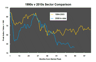 Sector prices have adjusted to the next level of support. The parallel with the 1990s is being tested. Prices will have to stabilise around current levels for several months for the thesis to hold.