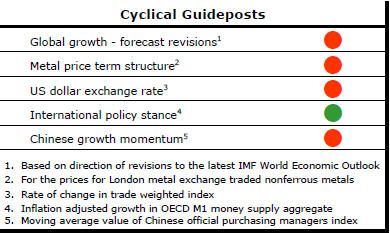 The PortfolioDirect cyclical guideposts suggest that the best possible macroeconomic circumstances for the resources sector will involve a sequence of  upward revisions to global  growth forecasts, the term structure of metal prices once again reflecting rising near term shortages, a weakening US dollar, strong money supply growth rates and positive Chinese growth momentum.  Only one of the five guideposts is "set to green" suggesting the sector remains confined to the bottom of the cycle .