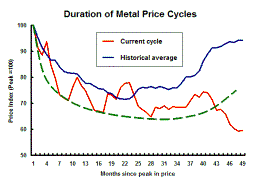 Using the prices of the six main daily traded base metals - aluminium, copper, lead, nickel, tin and zinc - the blue line in the chart shows, for the nine price cycles since 1960, the profile of the average adjustment following each cyclical price peak.